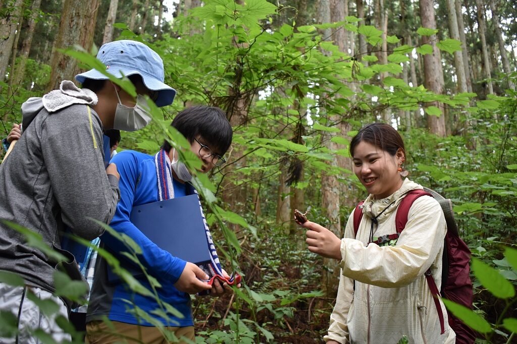 林の中へ分け入り、イノシシやシカの足跡など生き物の痕跡を見つけに行きます。