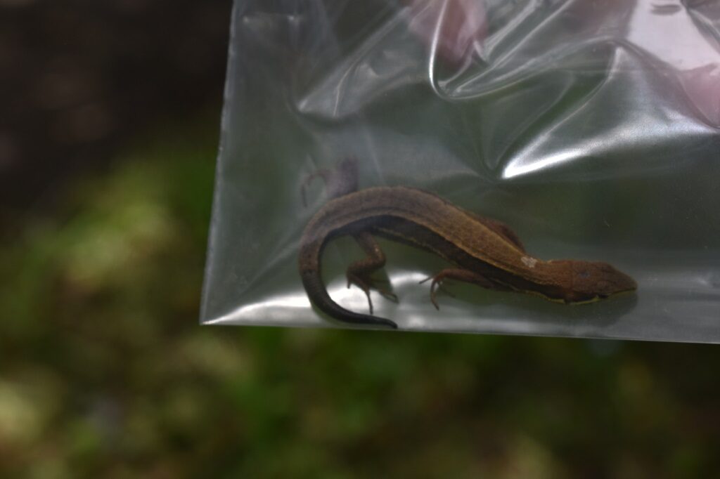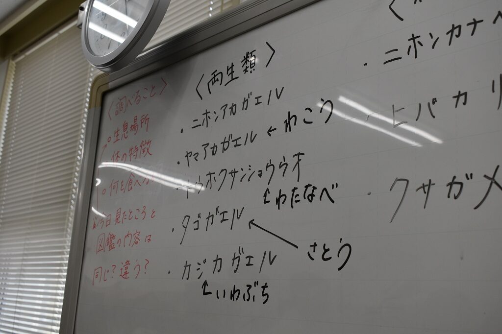 両生類も間近に観察、その後、図鑑で同定も行いました。