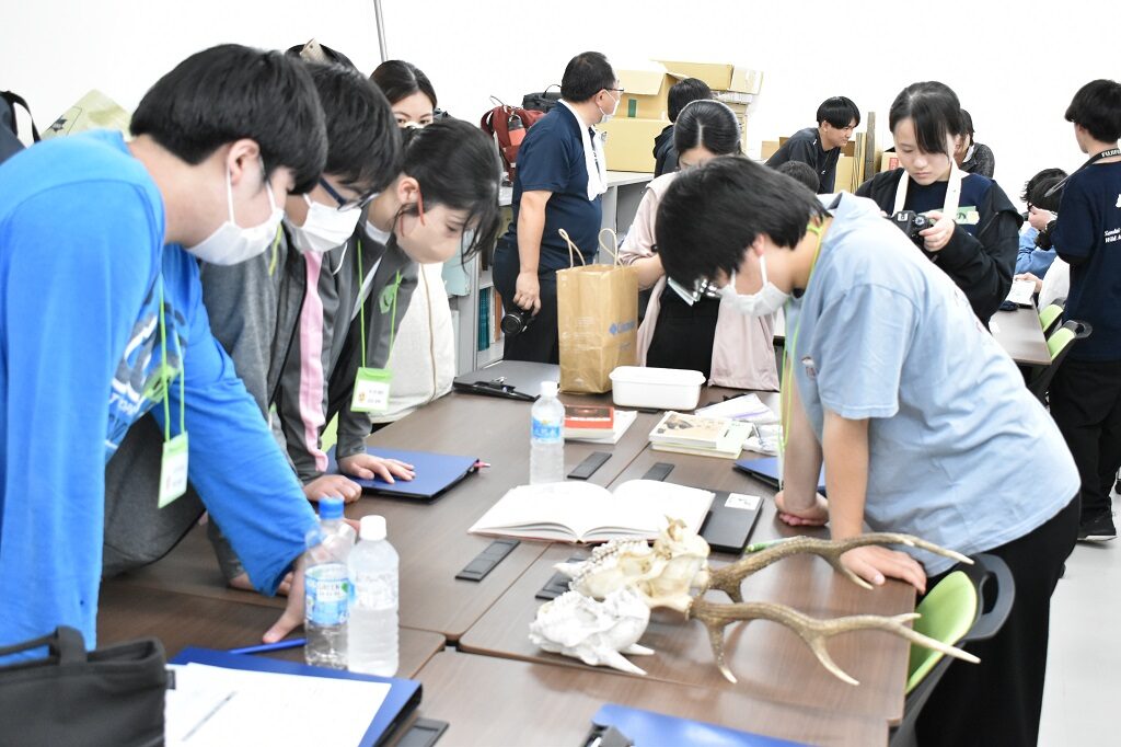 哺乳類の頭蓋骨標本と骨格図鑑を見比べています。