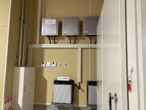(下の写真)パワーコンディショナーとリチウムイオン充電池の設置状況。