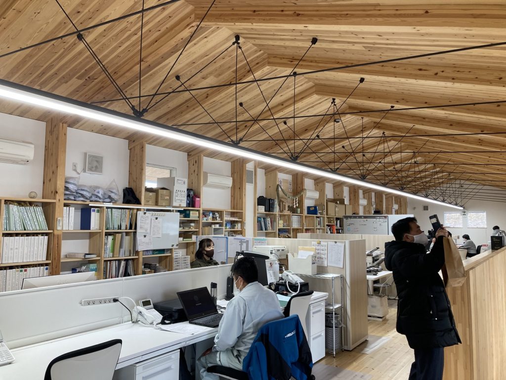 ・社屋 — 木造 2階建て 、延べ 419.38㎡[CLT材(直交集成板)を全面に使用]